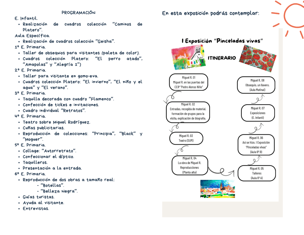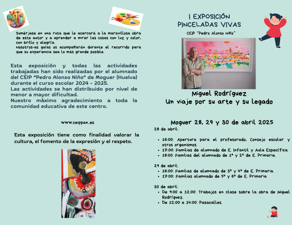 El CEIP Pedro Alonso Niño complace anunciar la celebración de las jornadas <<Pinceladas Vivas: Miguel Rodríguez, un paseo por su arte y legado>>, una propuesta educativa y cultural que rinde homenaje a la figura del artista local Miguel Rodríguez, acercando su obra y su legado a toda la comunidad educativa.